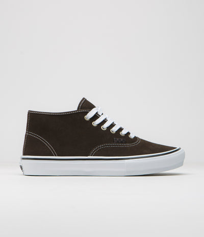 Vans Skate Authentic Mid VCU Shoes in Dark Brown and White. Part of Vans’ Checkerboard Union project, this Vans Skate Authentic Mid is designed with suede uppers and contrast stitching. Featuring a new two-part foxing, revised DURACAP reinforcements, a moulded heel counter and lock-in tongue straps, this brown Vans Skate Authentic Mid VCU also features a rubber Waffle outsole tread. Finished with woven checkerboard flag labels, metal lace eyelets, printed insoles and with Off The Wall Skateboarding rubber heel plates.
