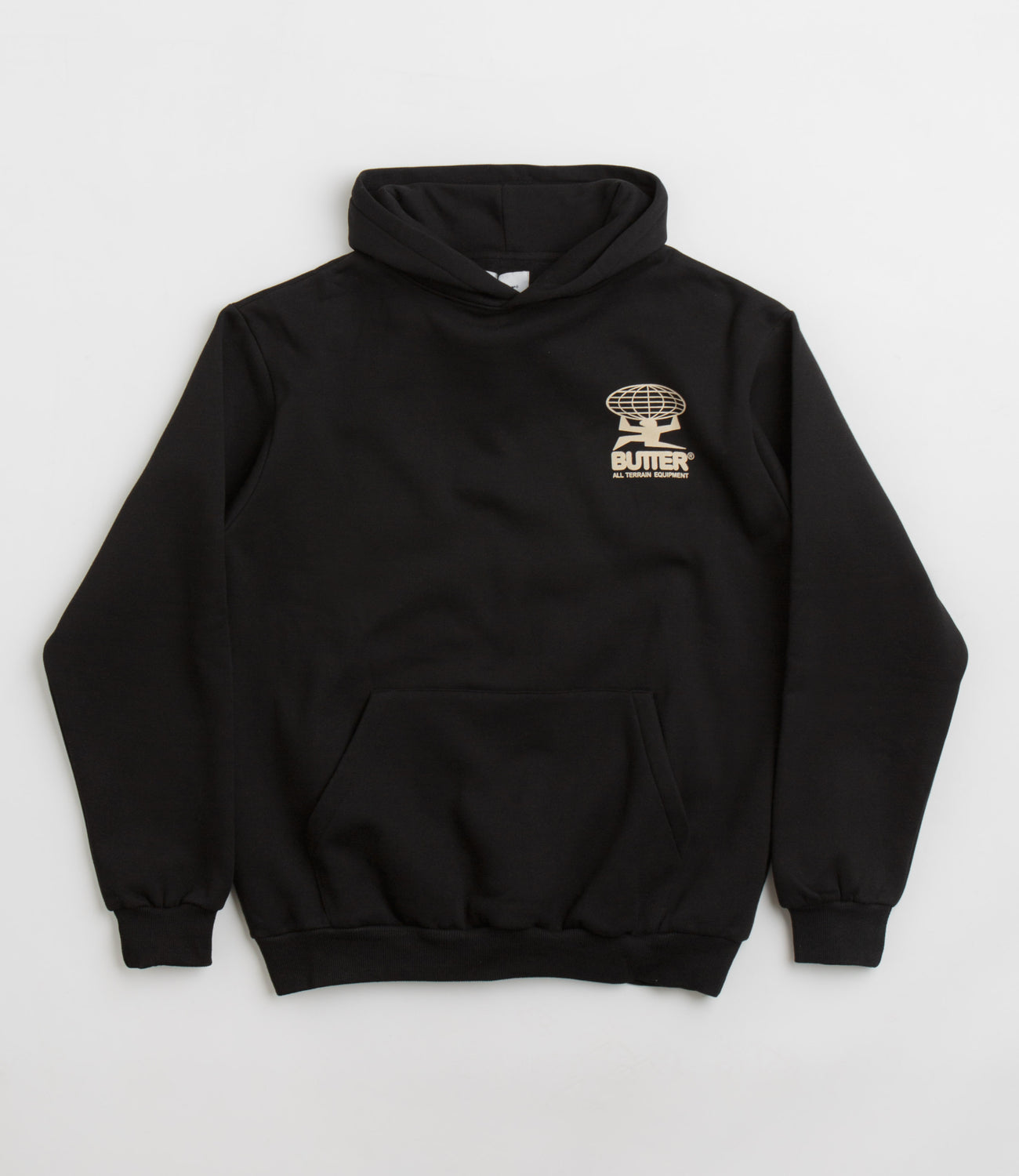Butter Goods All Terrain Hoodie in Black and Peach. Regular fitting and made from a heavyweight cotton-polyester blend, this Butter Goods hoodie is styled with dropped shoulders and a split panel hood. Featuring ribbed cuffs and a woven elastic hem, this black Butter Goods hoodie is finished with a front pouch pocket and with screen printed front and rear graphics.