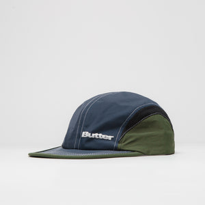 Butter Goods Trail Cap in Black. Single sized and made from 100% nylon, this four panel Butter Goods cap is designed with mesh side panels and with contrast stitching. Featuring a taped seam peak and an adjustable hike-cord fastening, this black and blue Butter Goods cap is finished with a printed crown logo.