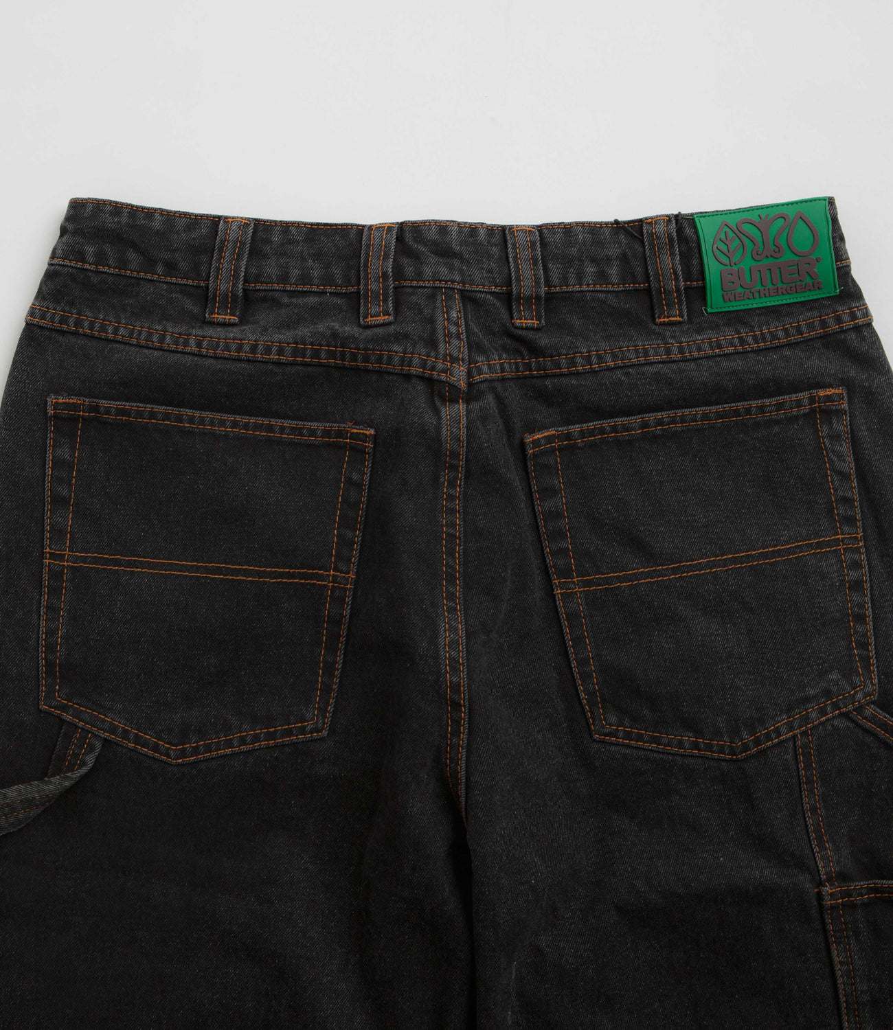 Butter Goods Weathergear Denim Jeans in Washed Black. Baggy fitting and styled with a tapered leg, these Butter Goods jeans are made from 100% heavyweight cotton denim. Featuring contrast stitching, a single button secured zipper fly and four classic pockets, these black Butter Goods jeans are finished with an embroidered coin pocket, a woven hammer loop, an additional utility pocket and with a rear rubber belt patch.