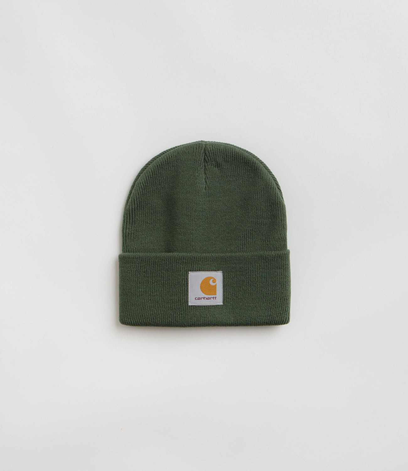 Carhartt Chase Beanie in Sycamore Tree and Gold. Single sized and made from 100% acrylic, this Carhartt beanie is designed with a stretchy rib knit face. Finished in a shade of green with an adjustable fold-over cuff and embroidered logo branding.